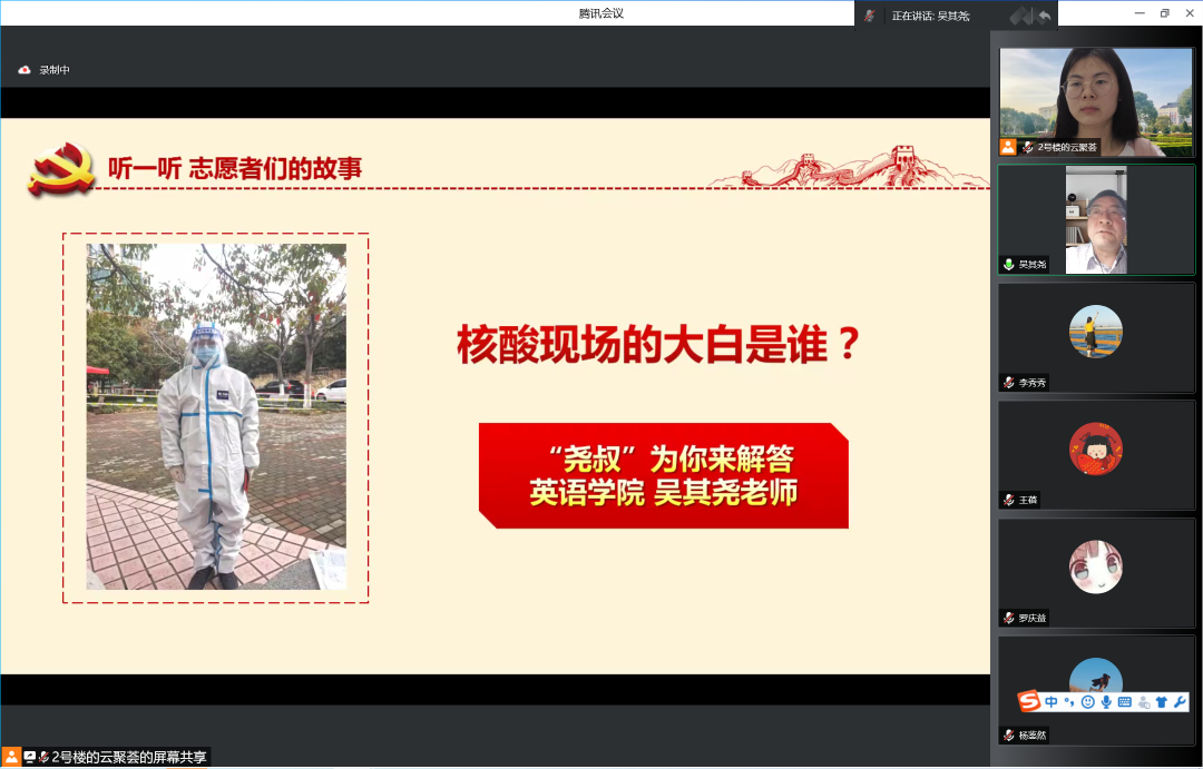 在活动第一环节,大家一同倾听了来自防疫一线工作师生志愿者们的战疫故事。首先,英语学院吴其尧老师分享了自己参与社区志愿服务、成为“大白”的经历和感受。吴老师了解到社区招募防疫志愿者,他表示“自己是中共党员,理所当然应该冲在最前线”,便立即报名,并一直坚持在教学工作之余参与防疫工作。在这期间,虽然需要身着密不透风的防护服在高温下持续高强度地工作,但当看到做核酸的医生“大白”坚守在岗位上、看到越来越多比自己年长的志愿者加入、听到同小区居民的感谢和认可,吴老师觉得人和人之间的关系也拉近了很多,自己也因此收获了许多感动。