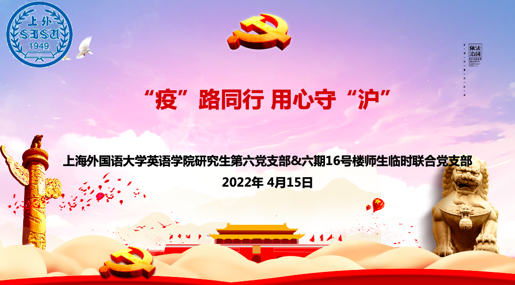 2022年4月15日,上海外国语大学英语学院研究生第六党支部与六期16号楼师生临时联合党支部开展主题为“‘疫’路同行 用心守‘沪’”的联学共建活动。活动由英语学院研究生第六党支部书记方艳菲主持。