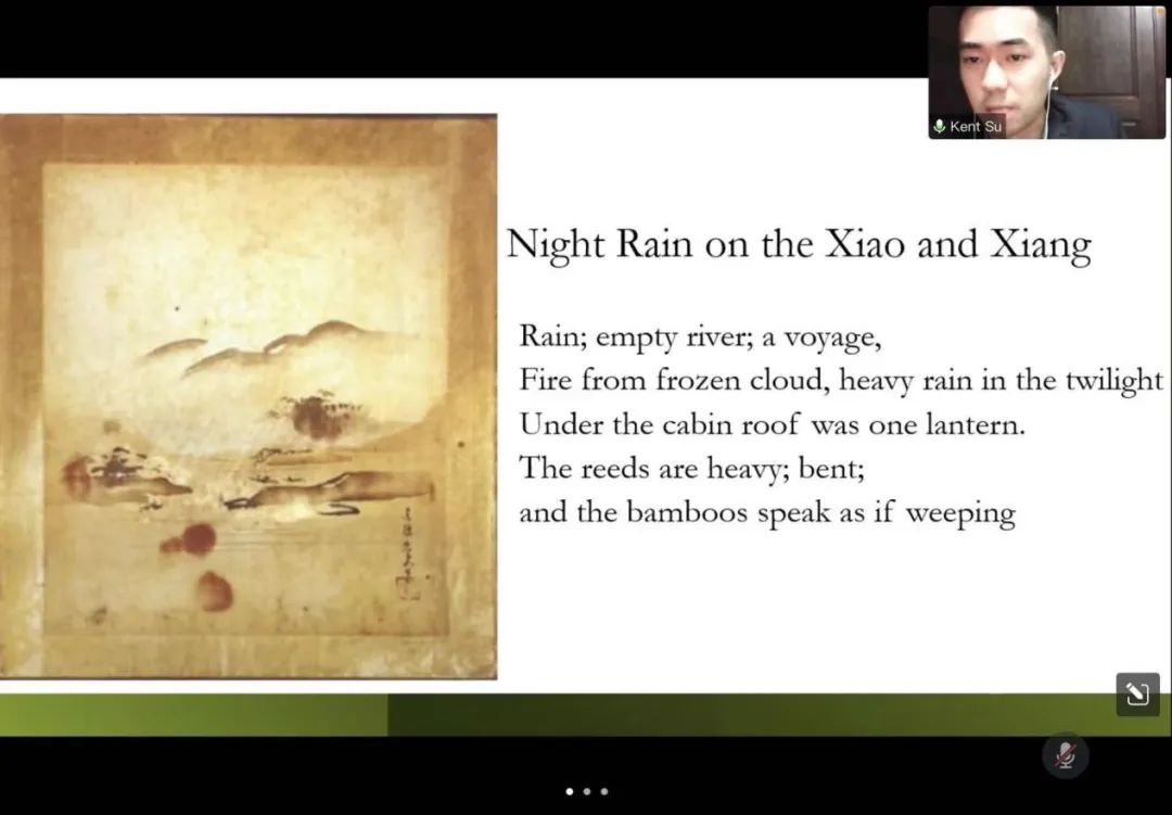 接着,苏老师基于《第4诗章》和《第49诗章》和所对应的山水画,深入阐释了庞德所期望重建于现世的盛世乐园与中国山水的联系,揭示出两个诗章通过描写自然而呈现出的道家核心概念“无为”和“天人合一”的自然观念。这两个诗章中的景色是庞德在诗歌创作中所追求的平静的、短暂的天堂般境界的一瞥。随后,苏老师分析了《中国史诗章》中中国风景的象征意义,风景的变化代表着混乱与秩序之间永不停息的变化,也象征着中国历史发展的两个方向。庞德由中国山水画追根溯源,关注以儒家思想为代表的中国古典哲学,而他提倡儒家思想的目的是为了实现国家的和谐,进而在20世纪初西方世界重建盛世乐园。