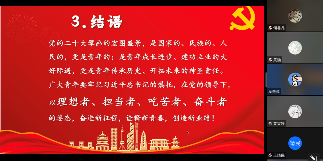 2022年11月4日,英语学院学生党支部书记党的二十大精神专题学习暨第三期头雁讲堂活动在线上召开。专职组织员张文洁老师、各学生党支部书记及部分支委参加活动。