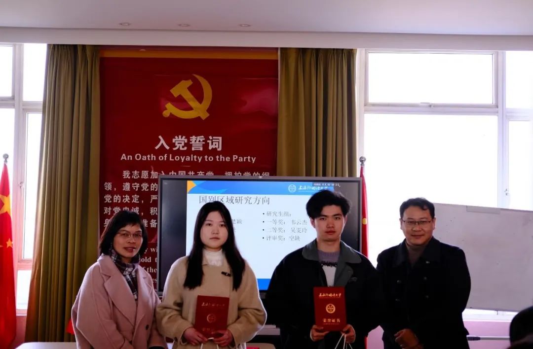 接下来,颁奖仪式正式开始。本次征文的范围涵盖文学、语言学、翻译学、比较文学与跨文化研究和国别区域研究五大方向。每一方向获奖的本科生、研究生同学依次上台领取获奖证书和奖品。最后,所有出席师生共同合影,为此次颁奖仪式画上完美的句号。