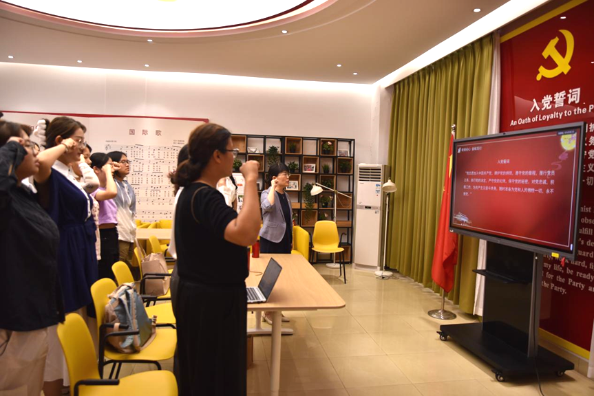 学院党委副书记曹原领誓。党员们高举右手,握紧拳头,庄严宣誓。铿锵有力的声音环绕整个活动室。党员们在铮铮誓言中回溯精神根脉,团员们在庄严语句中感受涌动初心,更加坚定了为共产主义事业奋斗终身的理想信念。