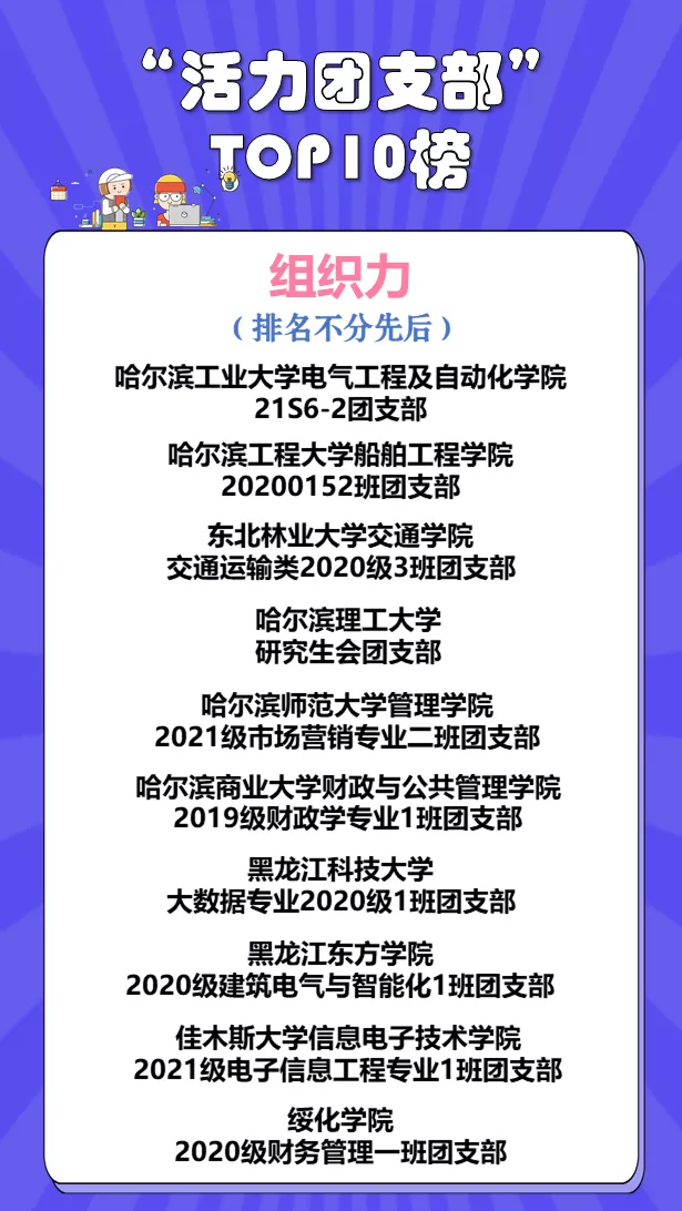 近日,团省委、省学联开展了2022年度黑龙江省高校“活力团支部”风采展示活动。通过各高校点赞转发数量,结合团支部建设成果和日常工作,最终确定《2022年度黑龙江省高校“活力团支部”最具(引领力、组织力、服务力、贡献度、改革味、好作风)TOP10榜》。