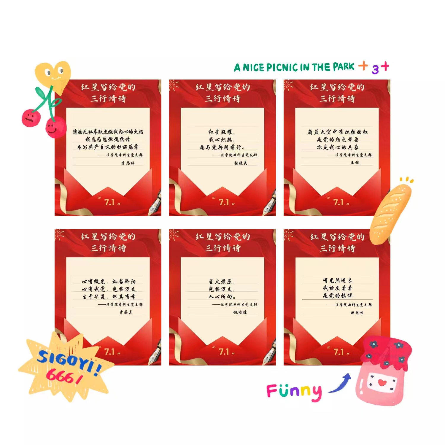 落笔三行,情意成诗。学生党员李思林写下了这样的话:“您的无私奉献,点燃我内心的火焰。我愿为您燃烧热情书写共产主义的壮丽篇章。” 江河万里,七月的丰碑耸立不朽。支部党员田思怡在三行情诗中写到“有光照进来,我抬头看看,是党的模样。”学生党员们用简练的语言、深情的笔触,将真挚的情感融入字里行间。字落于纸,情流于言,三行情书说不完对党的碧血丹心,道不尽与党的情意绵绵。这献给党满怀真挚的情书,在中国共产党成立102周年之际祝福我们伟大的党永葆青春!