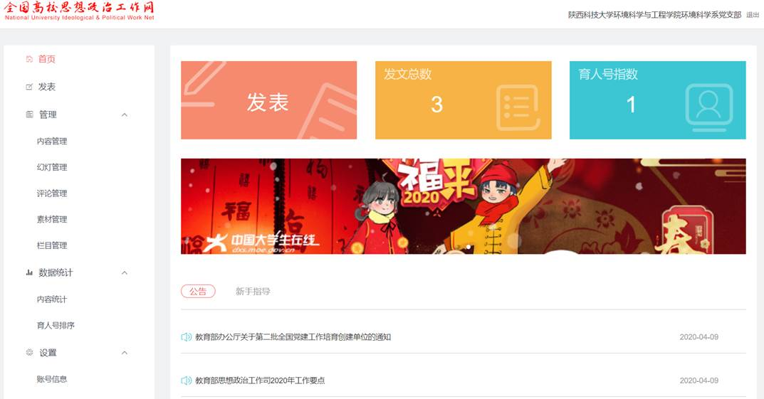 《全国高校思想政治工作网》是高等教育出版社主办,教育部主管,教育部思政司指导的全国高校思政工作的资源集散库、思想文化策源地和宣传舆论风向标平台,其栏下育人号是高校党建示范创建和质量创优工作培育成果展示平台(图7-9)。支部以此为窗口,展示党建工作经验和成效,宣传支部动态,并作为与其他样板支部交流的渠道。