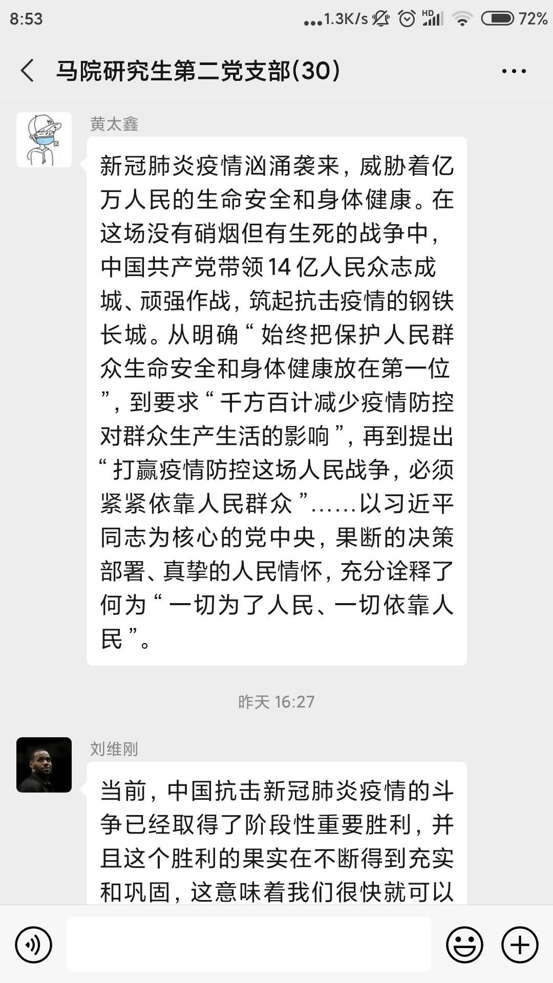 为深入学习贯彻习近平总书记关于新冠肺炎疫情防控重要讲话及指示精神,在疫情防控工作取得阶段性胜利的同时坚定打赢这场疫情防控的人民战争、总体战和阻击战的信心,进一步发挥基层党支部的战斗堡垒作用和党员的先锋模范作用,4月9日下午,研究生第二党支部召开以“坚定信念共克时艰”为主题的线上主题党日活动,会议由支部书记郝明主持。