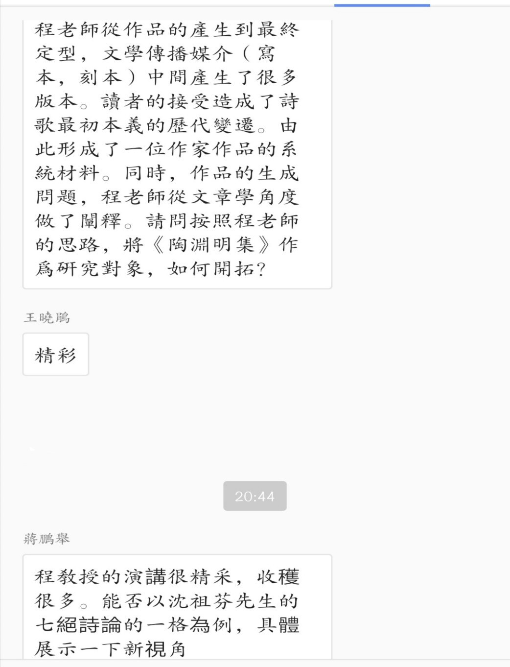 讲座接近尾声,杨晓斌教授进行了总结性发言,希望同学们认真学习程教授在讲座中涉及的新视野、新角度,在今后的研究中能够学以致用。同学们也根据讲座内容在讨论区提出了自己研究时的困惑,程教授都进行了详尽的解答,现场互动氛围热烈。最后,程章灿教授建议同学们:诗学研究需知能合一,学习作诗可以提高诗歌理解能力;继承传统的学术优势与学习西方的新观念新方法兼顾,才能真正做到守正与创新。