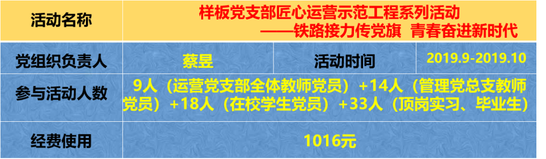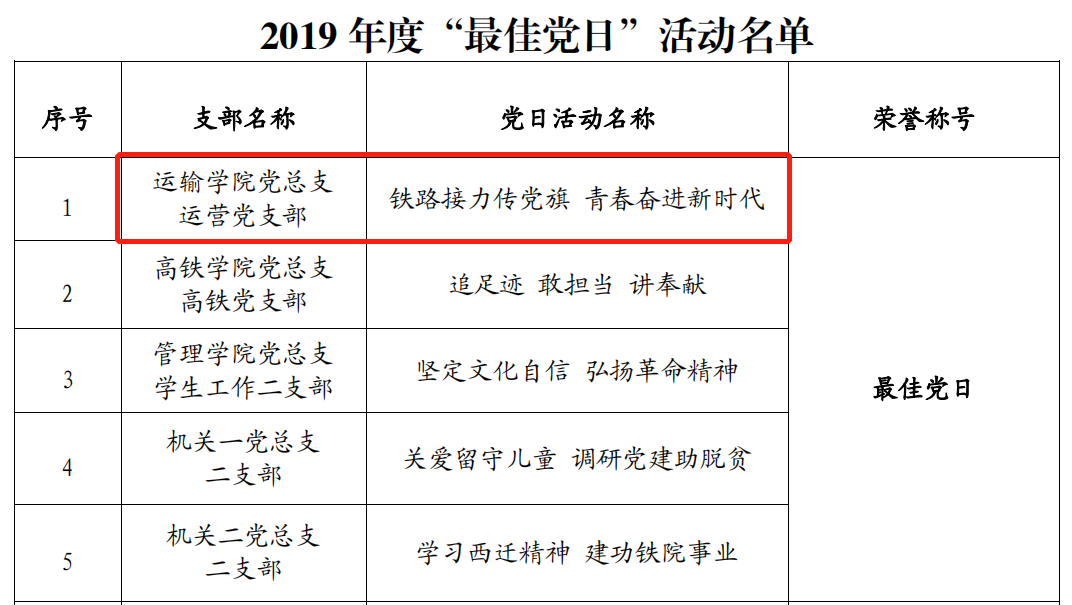在2019年度最佳党日活动和优秀党日活动评选中,经校党委会审定,运营党支部的“铁路接力传党旗 青春奋进新时代”党日活动获得“最佳党日”活动荣誉称号。