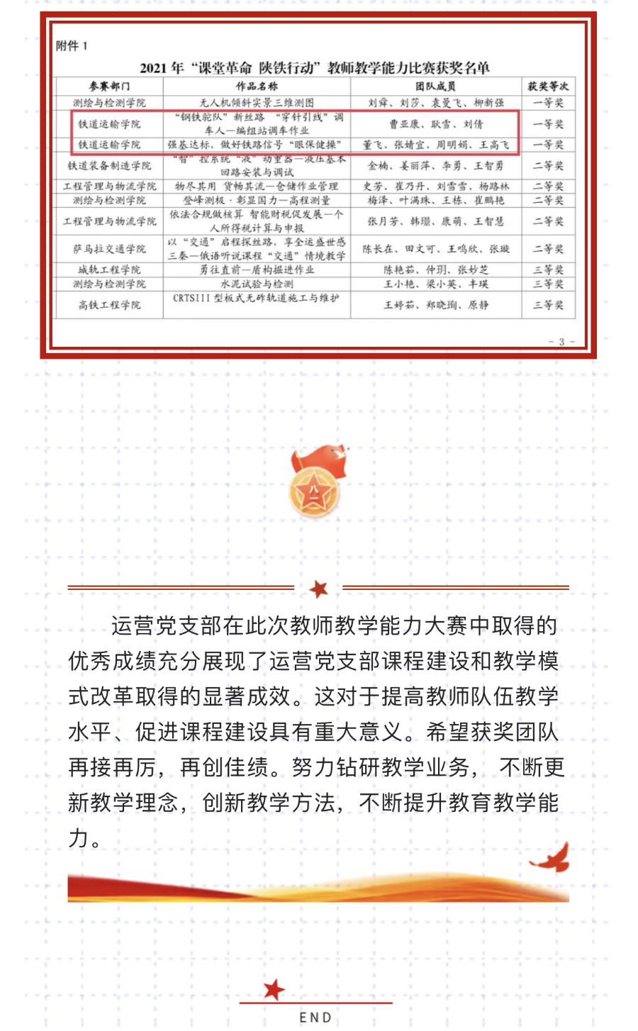 1.运营党支部教师团队荣获“课堂革命 陕铁行动”教师教学能力大赛一等奖