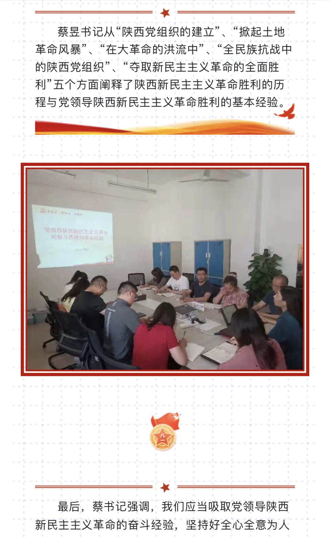 以史鉴今,立党治国,加强党员对党史的学习,是新时期党的建设的需要。蔡昱书记以“学党史,守初心,担使命——党领导陕西新民主主义革命的奋斗历程和基本经验”为主题,为党员教师们带来了一堂生动的党课。