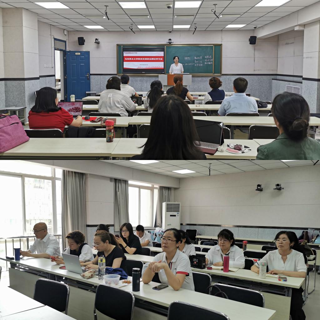 马克思学院党支部组织委员杜欢带领大家集中学习了《党员干部纪律读本》、《党史100题》有关知识,以违反《新时代高校教师职业行为十项准则》典型案例为警示教育题材,用行业事教育行业人,用身边事感染身边人,引导全体教师吸取有关教训,引以为戒。