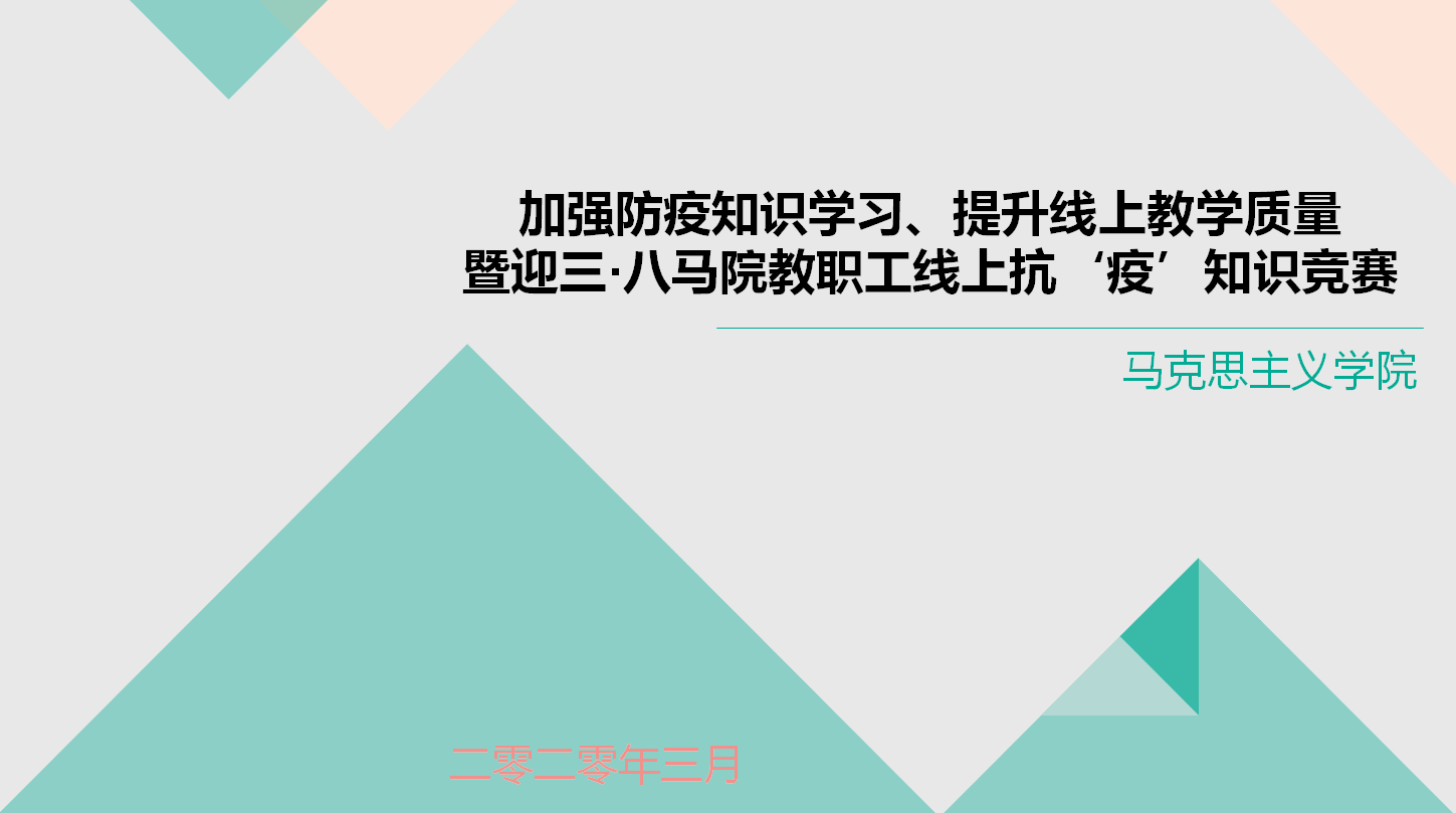 为提升我院全体教职工抗击疫情的信心,加强教师职工对学校疫情防控工作的理解,营造一个良好的节日氛围,使马院女教职工度过一个难忘而有意义的节日,马克思主义学院分工会于3月7日举办“加强防疫知识学习、提升线上教学质量暨迎三•八马院教职工线上抗‘疫’知识竞赛”。学院全体教师参加了此次知识竞赛活动。