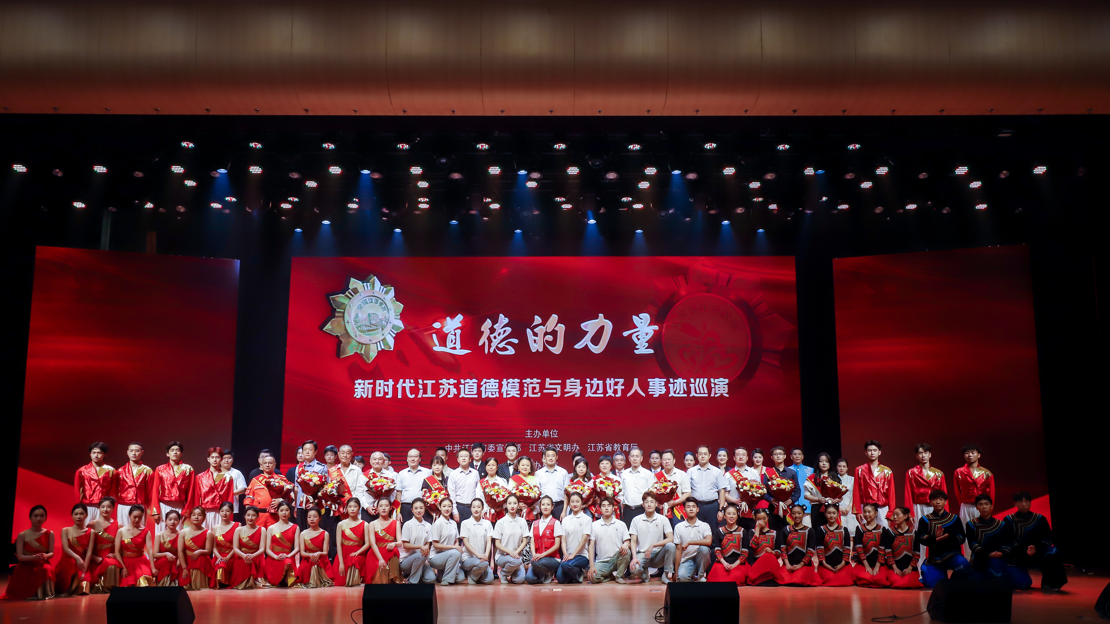 为进一步推动学习贯彻习近平新时代中国特色社会主义思想主题教育走深走实,深入学习贯彻党的二十大精神,充分发挥先进典型和模范人物教育人、鼓舞人、引领人的示范作用,6月9日,由中共江苏省委宣传部、江苏省文明办、江苏省教育厅主办的“道德的力量”——新时代江苏道德模范与身边好人事迹巡演在我校天赐庄校区存菊堂举行。