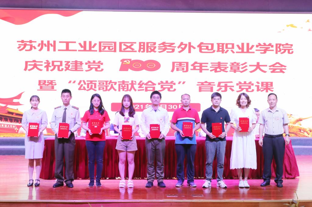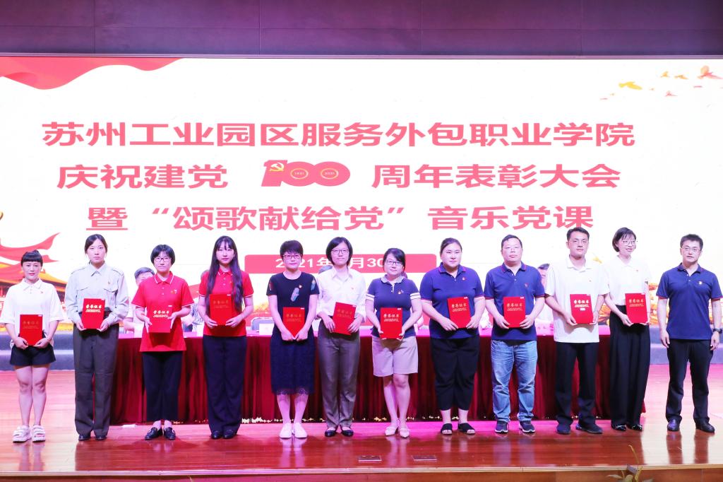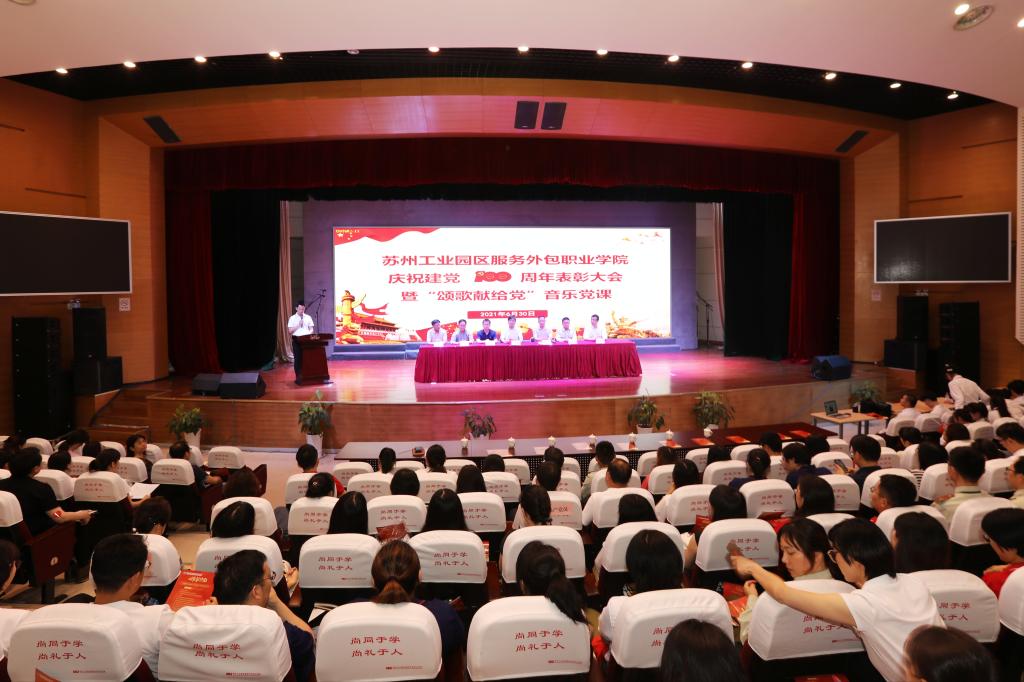 表彰大会结束后,进行了“颂歌献给党”音乐党课。我校各党总支纷纷登台演出,演唱经典红色歌曲,曲目包括:《保卫黄河》、《没有共产党就没有新中国》、《解放区的天》、《团结就是力量》、《军民大生产》、《我们走在大路上》、《游击队之歌》、《歌唱祖国》等。展演中,大学生艺术团带来了红色舞蹈《盛开》,啦啦操队进行了《歌唱祖国献礼百年》的精彩表演。我校荣获苏州市高校演讲比赛一等奖的学生何婧雯现场朗诵了《难寻少年时,总有少年来》,带领大家重温党的历史,激励大家传承红色基因。学生胡治现场朗诵了《红铁》,深情述说革命征程中感人肺腑的故事,该作品曾被“学习强国”平台刊载。