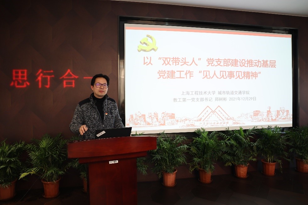 上海工程技术大学城市轨道交通学院副院长、教工第一党支部书记郑树彬作《以“双带头人”党支部建设推动基层党建工作“见人见事见精神”》报告,介绍了支部通过实施两项工程、建立三项制度、打造四个平台实现党建和业务双带头,不断扩大和提升轨道交通专业的服务辐射力和软实力的做法和经验。郑树彬指出,要做好党建工作和学科发展工作,需要具备“功成不必在我”的精神境界和“功成必定有我”的历史担当。