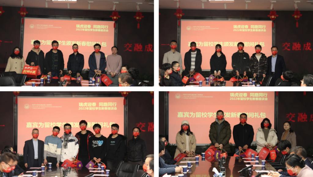 伴随着欢腾喜庆的新春音乐,座谈会现场氛围热烈而和谐。方雅静、马万经、凌建明等分别向寒假留校学生赠送学校和学院精心准备的新春慰问大礼包,希望同学们能够在留校过年的日子里,始终感受到学校和学院诚挚的心意和浓浓的关爱。