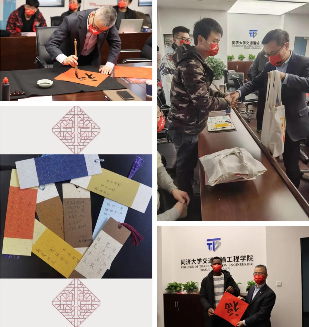 座谈会特别增加了富有中华传统文化意味的师生互动环节。马万经书记将装有口罩、围巾、春联和学科先师纪念文集《筚路蓝缕》的礼包一一送到同学们的手中,希望同学们新的一年从身体武装到头脑。凌建明院长挥毫书写“福”字和春联送给同学们,祝福同路人们2022年“虎步奔腾开胜景,春风浩荡展鸿图”。同学们纷纷表示,虎年有院长的祝福加持,一定能如虎添翼,“考试门门过,个个小五哥”。在场同学们也用花签寄语新年,来自刚果(布)共和国的留学生王子同学还现场体验了一把书写中国毛笔字的魅力。