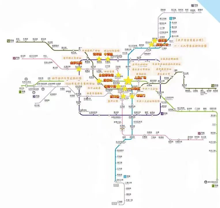 4号线沿线包含圣约翰大学旧址、中央造币厂旧址和正红纪念馆等红色场馆;8号线沿线包含中共中央政治局机关旧址、五卅运动旧址、中山旅游事件旧址、老闸捕房旧址等红色旧址;10号线沿线包含中共一大会址和纪念馆、《共产党宣言》展示馆等红色场馆;13号线沿线包含复兴公园、四行仓库、孙中山故居和新青年编辑部等红色场馆……在一幅上海地铁线路图上,记者看到红色场馆、旧址等字样,颜色鲜艳、标注清晰。