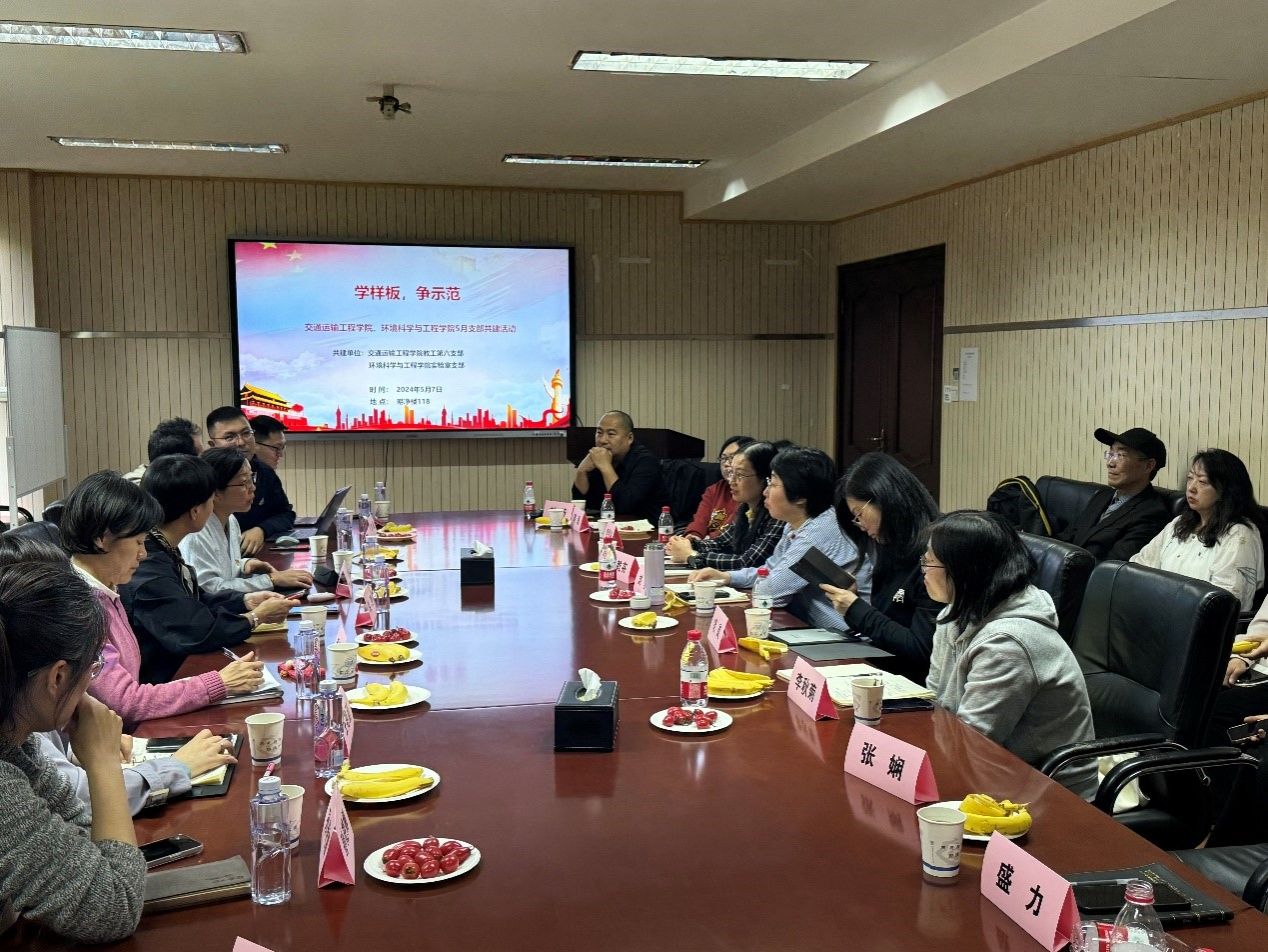 2024年5月7日下午,交通运输工程学院教工第六党支部和环境科学与工程学院实验室党支部在同济大学四平路校区明净楼会议室开展“学样板,争示范、促融合”联学共建活动。本次活动旨在深入学习贯彻习近平新时代中国特色社会主义思想和党的二十大精神,以党建引领实验教学示范中心提升,充分发挥学院间国家级实验教学示范中心与上海市级实验教学示范中心之间的“传-帮-带”作用。环境学院实验室党支部书记、实验教学示范中心副主任刘佳,示范中心副主任刘涛;交通运输工程学院副院长、实验教学示范中心副主任白玉,教工第六党支部书记、示范中心副主任洪玲及双方支部党员、教师代表共26人出席,会议由刘佳副主任和白玉副院长共同主持。