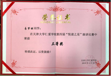 2018年参加校第四届“悦读之星”演讲比赛,荣获三等奖