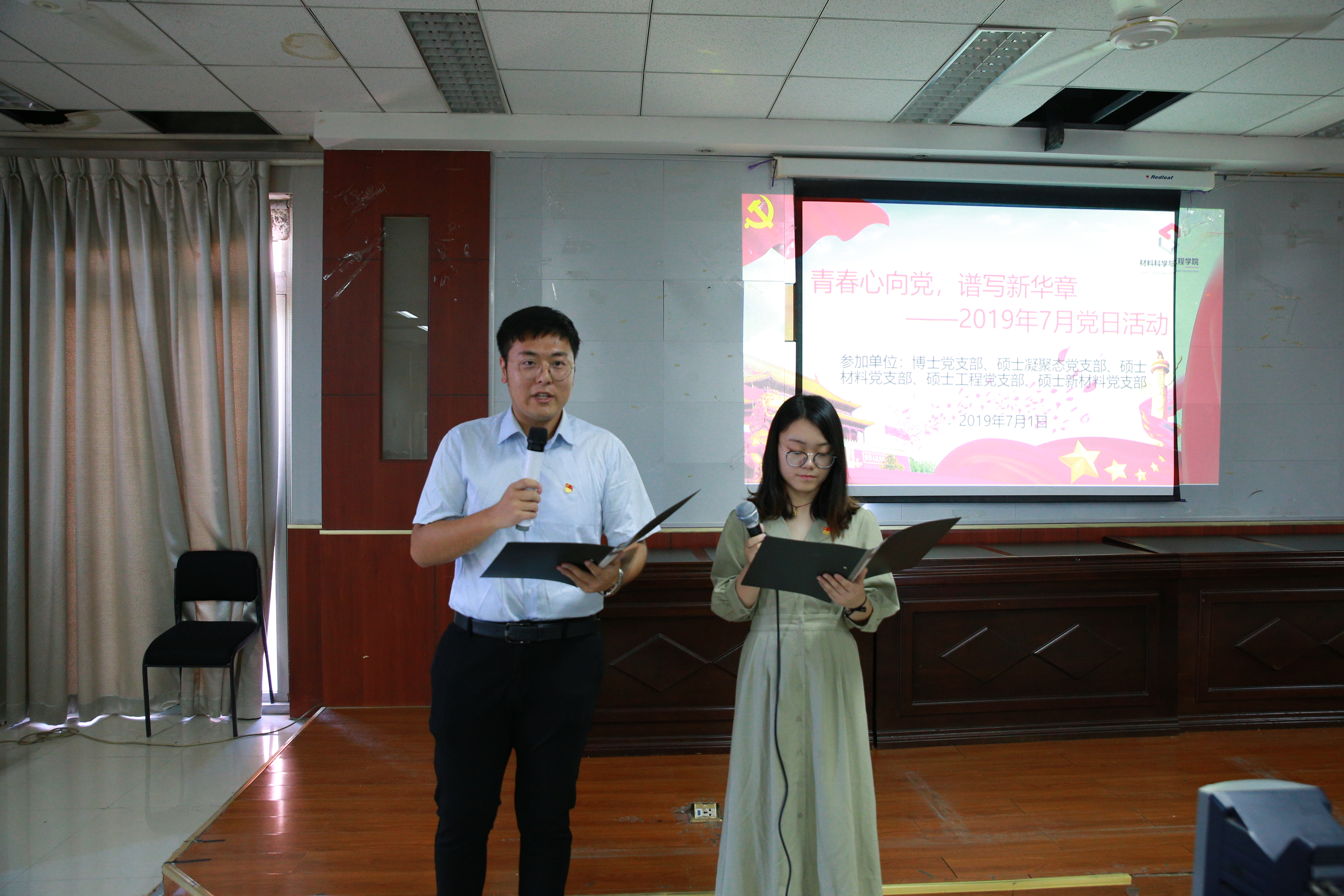 为庆祝中国共产党建党98周年,弘扬爱国主义精神,丰富研究生的文化生活,2019年7月1日,材料科学与工程学院博士研究生党支部与四个硕士研究生党支部联合举办 “青春心向党,谱写新华章”庆七一主题党日活动,用自己最朴实的表达向伟大的党献上诚挚的祝福。学院党政负责同志以及辅导员近100人参加此次活动。