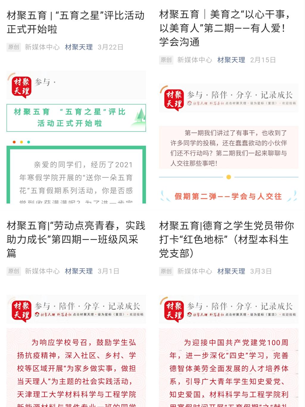 此前,在2021年的寒假期间我院为丰富同学们的假期生活,开展了一系列“五育并举”育人活动,比如“因为热爱,所以坚持”长跑打卡家乡红色地标德育活动、“以心干事,以美育人”美育活动、“劳动点亮青春,实践助力成长”劳育活动等。在此次系列活动中,学院精心组织,同学们积极参与,涌现出一批表现优异的同学。经过同学们的积极申报和学院严格评比,评选出5名同学分别获得材料科学与工程学院“德育之星”、“智育之星”“体育之星”“美育之星”“劳育之星”荣誉称号。