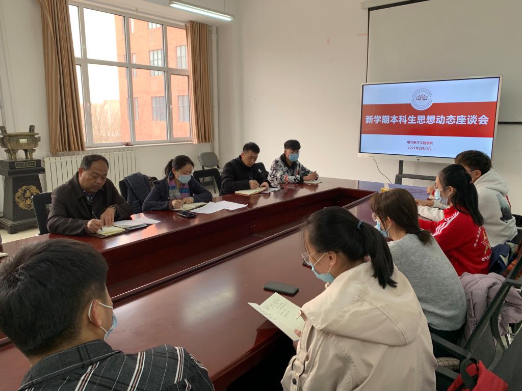 为深入了解学生对国家大事、社会热点的关注看法,及时掌握学生思想动态,加强与学生沟通交流,增强思想政治教育工作的主动性和针对性,电气电子工程学院分别于3月1日和3月17日召开返校研究生和本科生两场思想动态座谈会,学院党政领导、辅导员和学生代表参加活动。