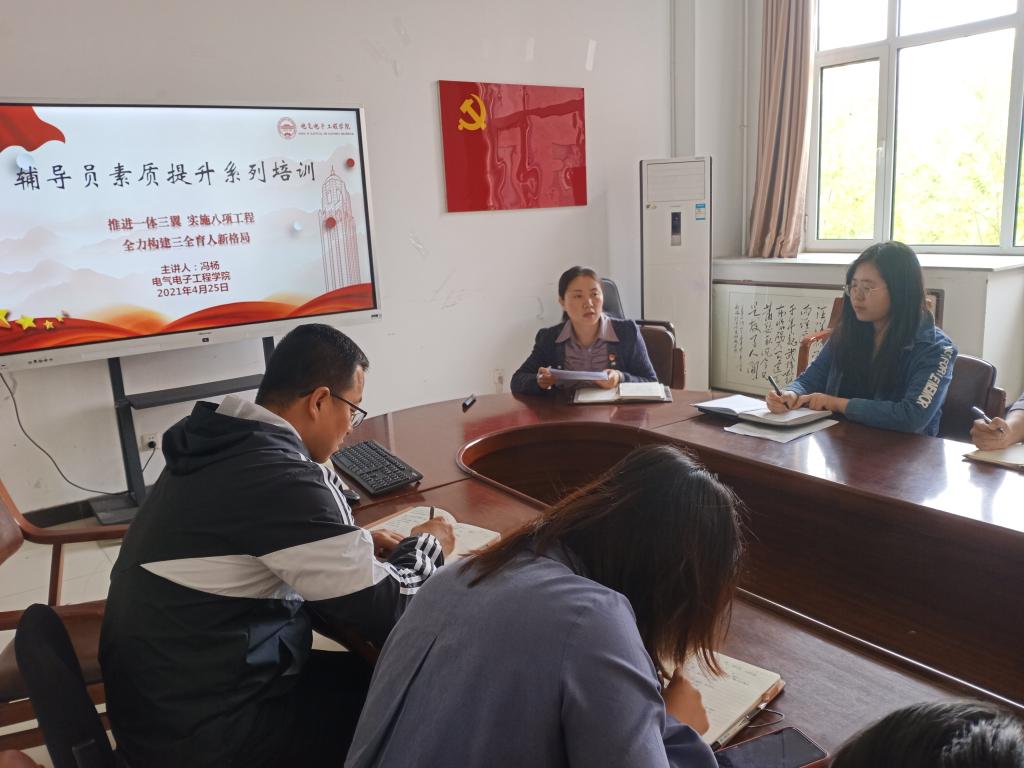 为提升学院辅导员素质能力,统一思想,凝心聚力,做好学生思想政治教育工作,4月25日,电气电子工程学院组织开展第四期辅导员素质能力提升培训,全体辅导员老师参加活动。