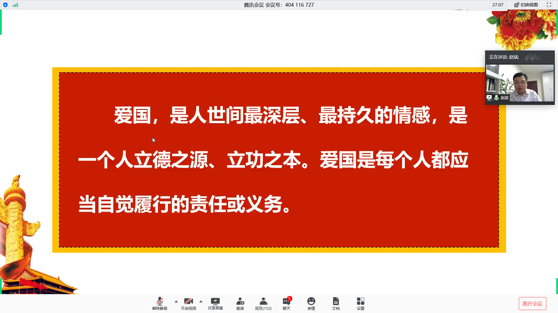 为落实教育部党组印发的《教育系统关于学习宣传贯彻落实<新时代爱国主义教育实施纲要>的工作方案》,扎实开展深入、持久、生动的爱国主义教育,引导广大学生爱国、爱党和爱社会主义高度统一,将爱国热情与报国行动有机结合,管理学院于2020年5月20日晚7点,邀请学院工商管理系赵斌教授为党员同学开讲题为《厚植爱国情怀 融小我于大我》云党课,辅导员邱虹老师主持本次会议,共计170余名学生党员参加此次活动。