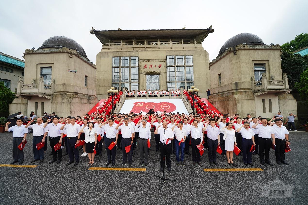 7月1日清晨,江城微雨,珞珈山郁郁葱葱,党旗格外鲜艳。中央党史学习教育中管高校第十指导组组长欧可平等全体成员、武汉大学全体校领导、新发展师生党员代表以及其他党员代表共300名党员,在行政楼前庄严宣誓,共同庆祝中国共产党百年华诞,献上生日祝福。校党委副书记屈文谦主持仪式。