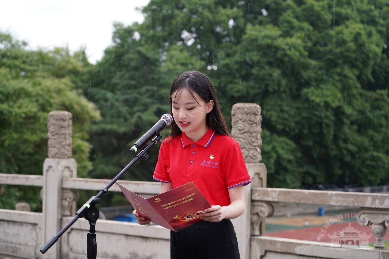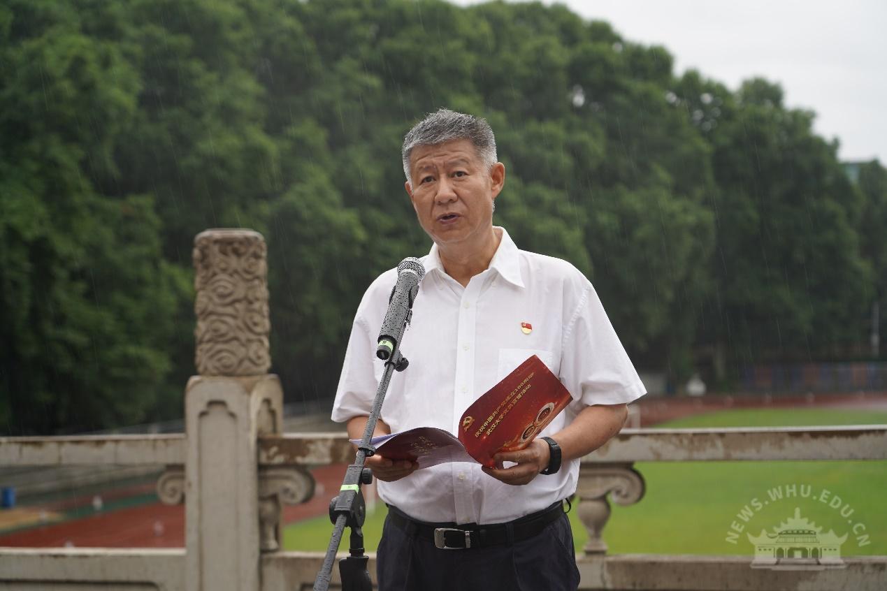 校党委书记韩进讲话指出,今天我们举行党员宣誓活动,庆祝中国共产党成立100周年,回顾党团结带领人民不懈奋斗的光辉历程,从党的百年历史中汲取力量,牢记初心使命、坚定理想信念,以更加昂扬的斗志开启新征程。浩浩党史、巍巍珞珈,武大人已将红色基因深深根植于自己的精神血脉之中,始终秉承家国情怀,将爱党爱国之情铭记于心、践之于行。