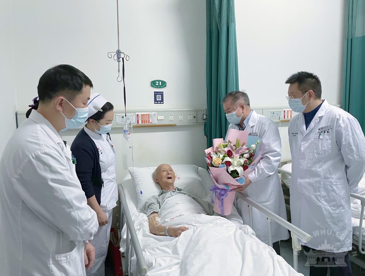 25日下午,武汉大学人民医院院长王高华得知蒋遵海在院治疗重获新生后,专门到病房探望慰问,致敬志愿军老英雄。