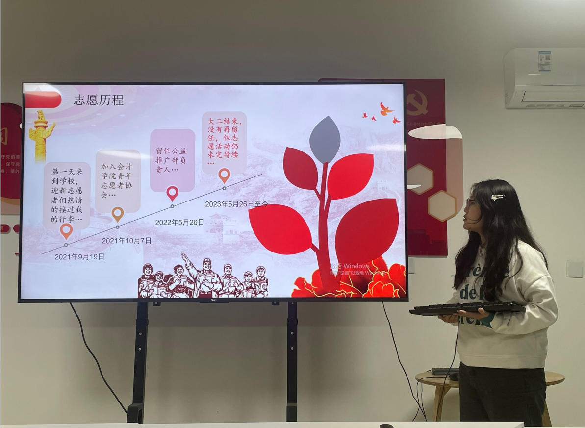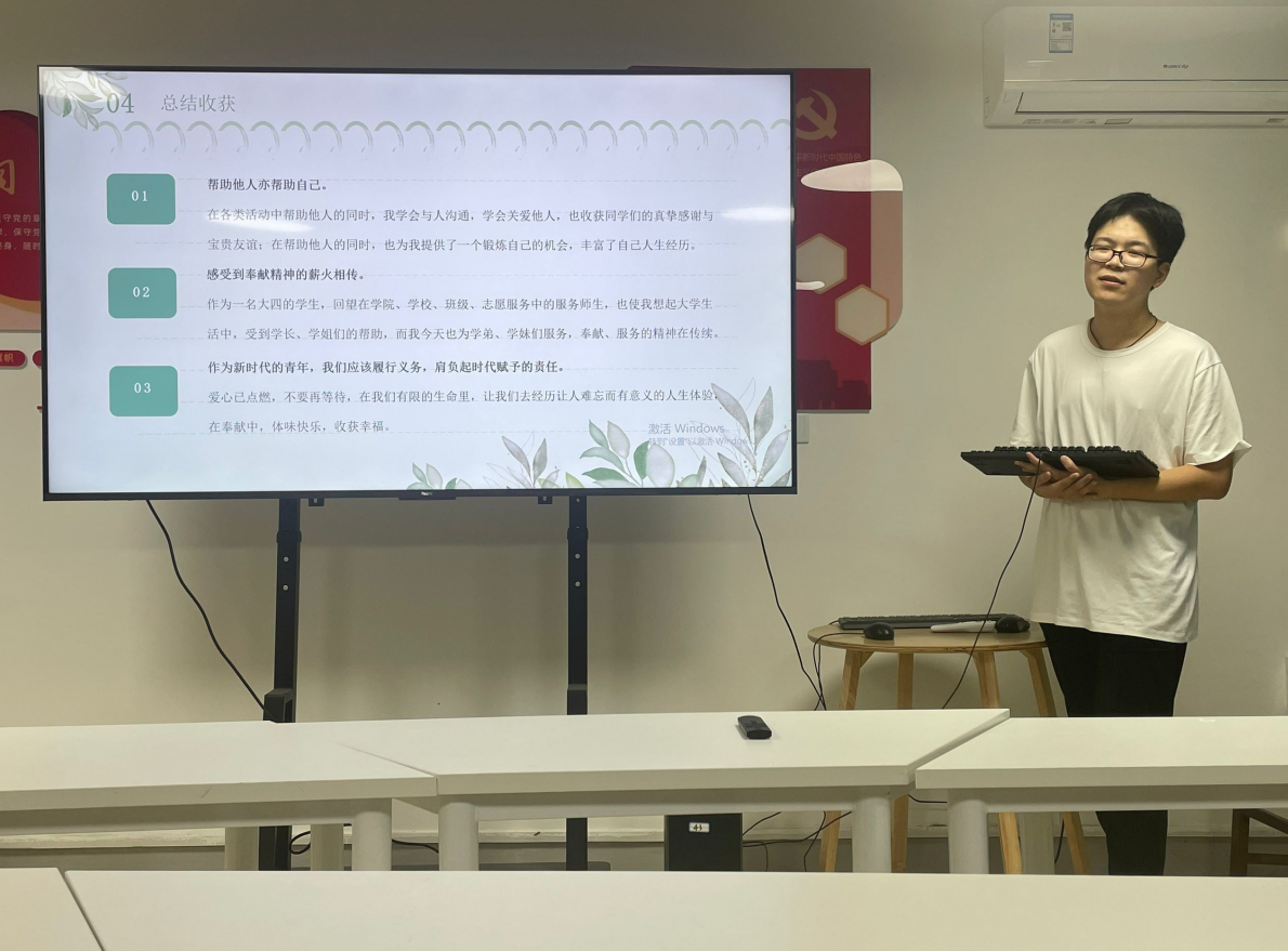 分享会上,支部书记王霄鹤回顾了支部今年以来在志愿服务、“一对一”帮扶等方面为师生办的好事和实事。党员代表毕晓蕊结合自己的任职情况介绍了自己为师生服务的各类经历。王仕铭分享了自己为师生做实事的故事并认为青年党员应该牢记党员义务,积极肩负起时代赋予的使命。党员詹佳瑶重点向支部党员分享了自己参与的校园志愿服务经历,她认为志愿服务是爱的奉献、爱的传递,更是爱的温暖。每位党员的分享都是鲜活有趣的,传递了满满的温暖和正能量。