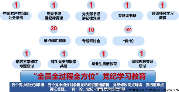 2024年上半年,安全科学与工程系党支部共开展党委书记讲纪律党课1次、党支部书记讲纪律党课1次、专题读书班1次、师德师风学习教育1次、难点词汇解读20条、党纪学习专题研讨会1次、“典”论100条、培养方案修订专题研讨1次、师生党支部联学共研1次、毕业生廉洁教育1次、课程思政专题研讨1次。支部全体党员均参与党纪学习教育,五个党小组分别承担党纪知识图谱解析、党纪修改亮点解读、党纪重难点词汇答疑、“典”论、党纪+课程思政双促双融等任务,着力实现“全员全过程全方位”党纪学习教育。