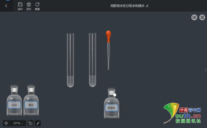 在之前的课程中,孩子们大多经历围绕在老师线上的PPT教学和线下的实验教学。实践队员考虑到孩子们天生对新兴事物的好奇心,因而在此次课程加入了他们可能从来没见过的虚拟实验环节。在虚拟实验平台上,实践队员早已准备好了用肥皂水区分硬水和软水实验的实验器材。随着实验的进行,孩子们的内心也逐渐澎湃,如同试管、试剂瓶和胶头滴管随着志愿者鼠标的移动而迸发出思维的火花。“装有硬水的试管中产生了沉淀和少量泡沫,相对而言装有软水的试管中产生了较多的泡沫。”实践队员绘声绘色地描述着实验结果的差异。实验结果的明显差异更是引起孩子们对科学实验的兴趣,而这种兴趣将在很大程度上成为他们未来追求真理的无限动力。