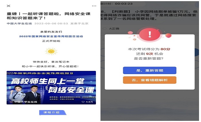 开展网络安全知识答题竞赛活动,以“中国大学生在线”微信公众号为依托,通过线上竞赛答题方式普及网络安全知识,帮助提高大学生防范网络诈骗、安全使用网络的能力。