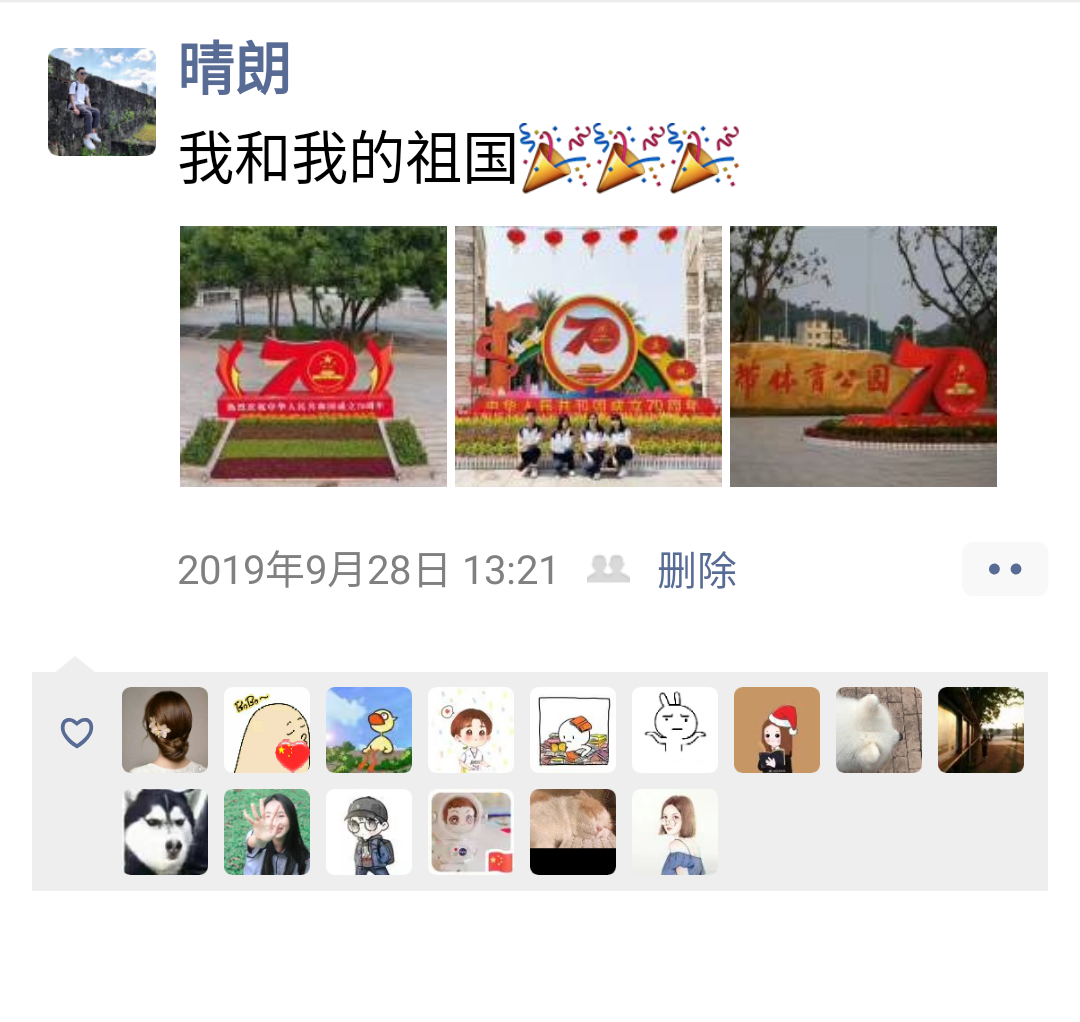 支部全体党员同志及入党积极分子于国庆期间积极开展“我与国旗同框”活动,通过寻找周边共庆新中国成立七十周年的景象,用照片定格下来,分享至朋友圈,与我们身边的人分享这份喜悦,展现我们对新中国成立七十周年的美好祝福。该活动得到广大同学的赞许,纷纷在朋友圈中评论点赞。