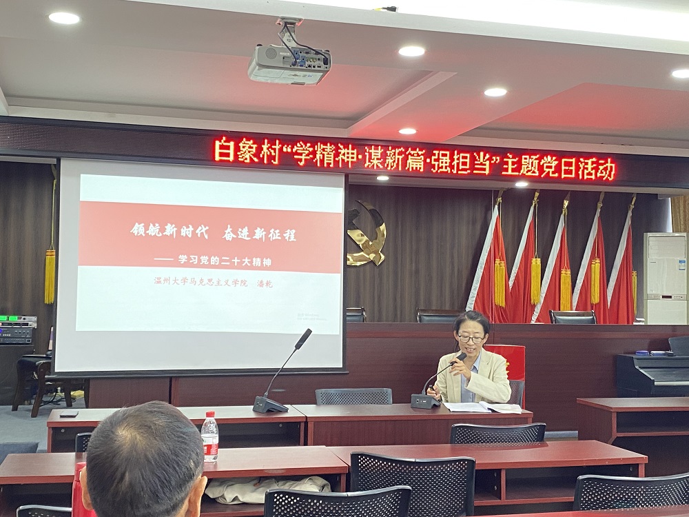 2022年11月18日下午,温州大学马克思主义学院项淳芳副教授来到温州市瓯海区南白象街道鹅湖村党员活动中心,以“中国共产党为什么能——学习党的二十大精神体会”为题作了精彩的主题宣讲。