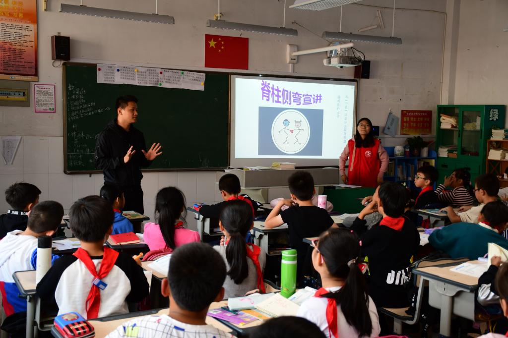 为普及脊柱侧弯知识,提高青少年保护脊柱意识,10月31日,温州医科大学第二临床医学院杏林青年志愿者服务社脊“良”正姿服务联盟走进瓯海实验小学龙霞校区,开展了知识讲座及公益筛查活动。 21名志愿者们走进该校五年级的四个班,围绕脊柱侧弯的简单概念、病因类型、病症危害和如何预防等方面介绍脊柱侧弯。活动采用沉浸式课堂方式,通过互动问答,增进孩子们对脊柱侧弯知识的理解。关于预防侧弯,讲解员邀请同学们上台示范正确的站姿、坐姿,对错误示范也请同学们做出指正,增加了宣讲的趣味性和实用性。孩子们的认真听讲和积极参与,让整体氛围轻松愉快,也让宣讲人员更加投入。