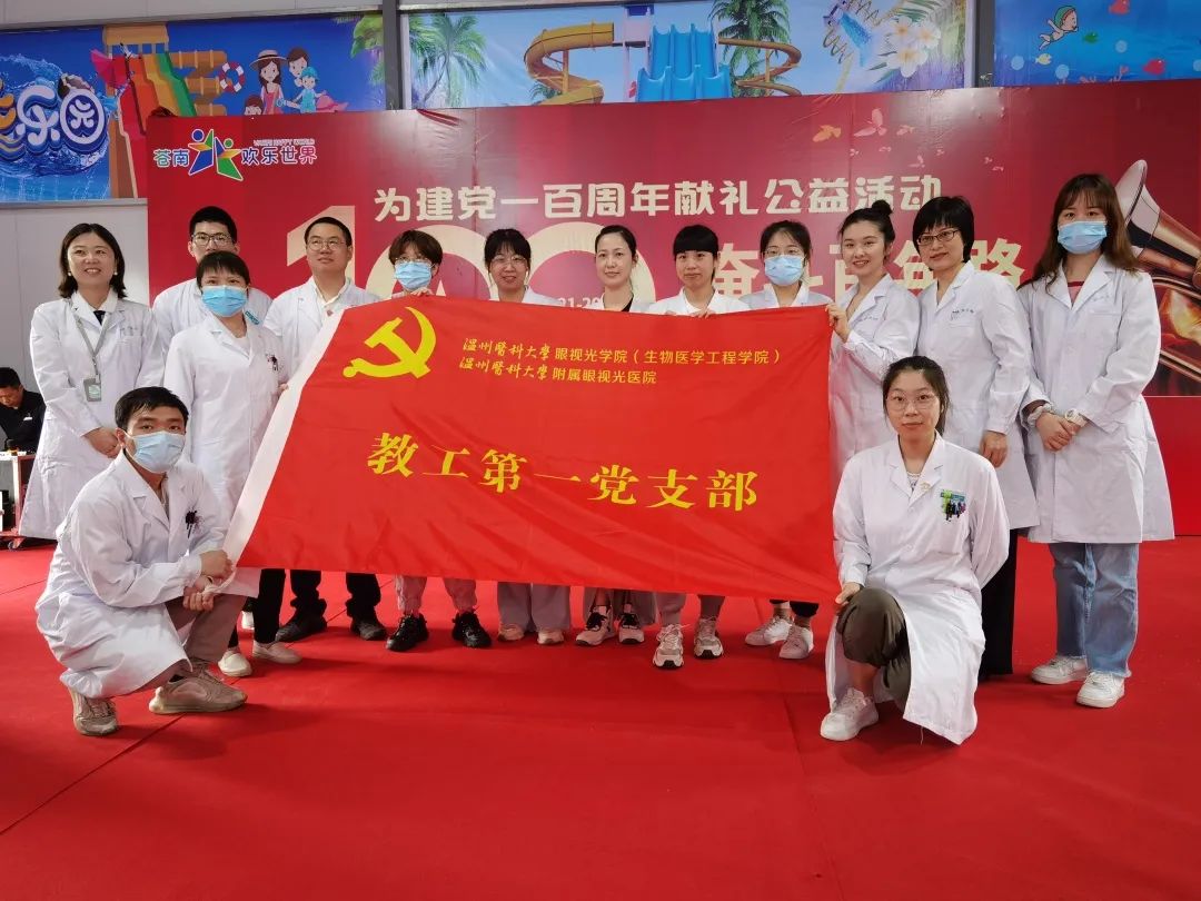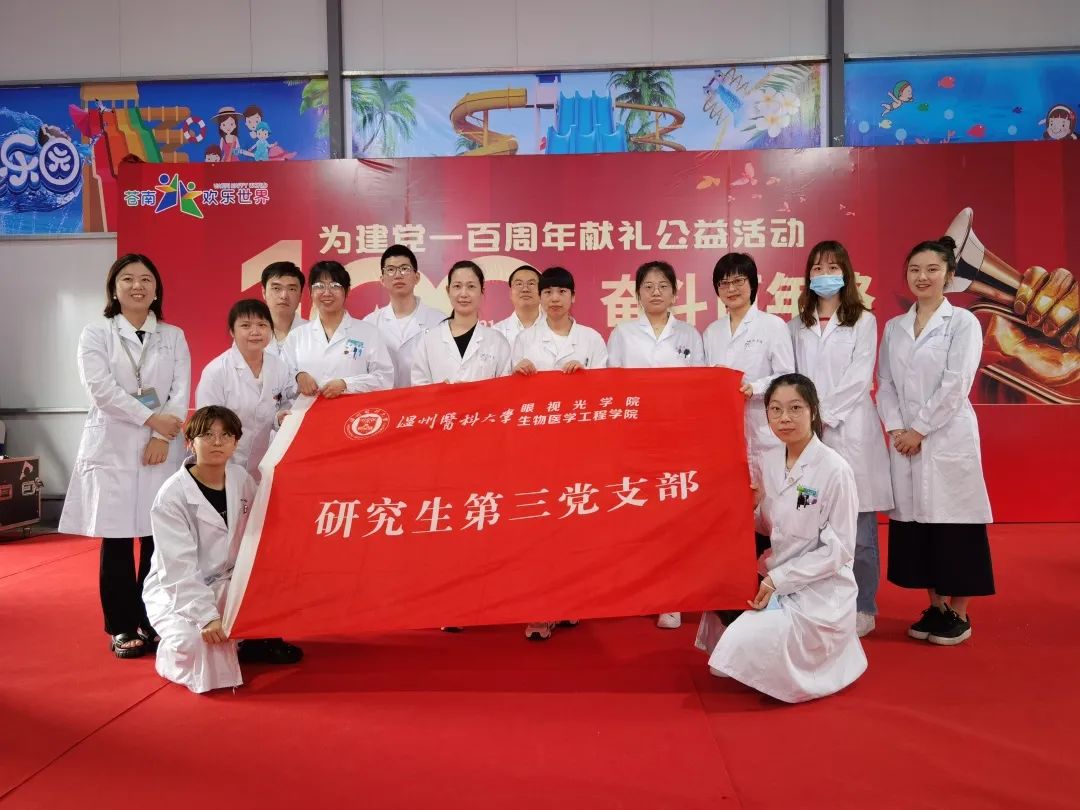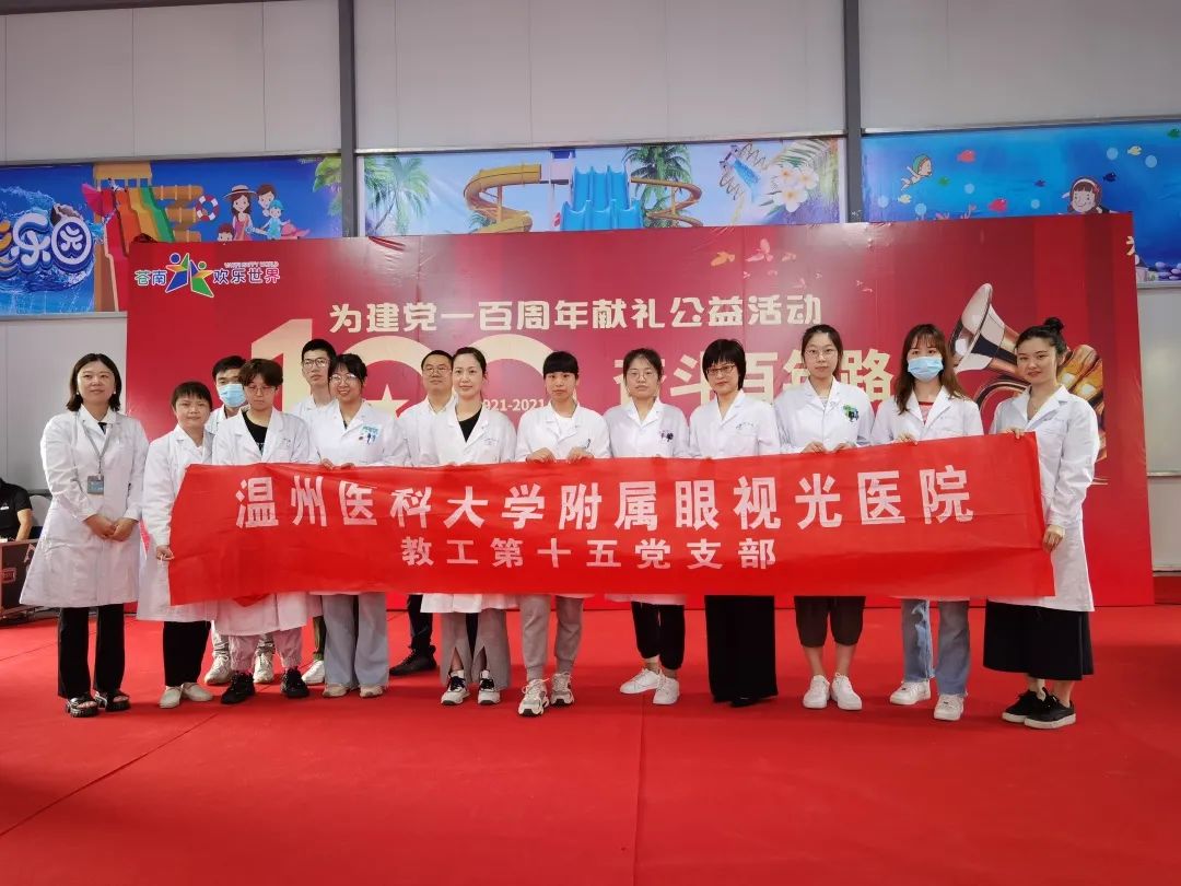 为庆祝建党100周年,5月29日上午9点,在苍南县欢乐世界,由民进苍南基层委、温州医科大学附属眼视光医院联合主办为儿童青少年送健康活动。我院教工第一党支部、第十五党支部以及研究生第三党支部的师生一起参与此次活动。