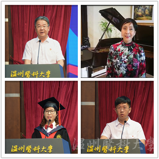 教师代表卢中秋勉励毕业生们传承温医人的家国情怀和质朴勤勉的作风,坚守初心、勇担使命,脚踏实地、艰苦奋斗;我校1977届校友、澳大利亚布里斯班眼科医生,世界宫颈癌疫苗发明者周健博士夫人孙小依分享了她与爱人的奋斗故事,激励毕业生们努力前行、创造美好生活;研究生毕业生代表叶捷在发言中回顾了她在温医大求学的十年时光里,所学到的、看到的,以及未来还会坚持做的事;本专科毕业生代表柯守煜表达了对母校、老师、辅导员和同窗的感谢与不舍。
