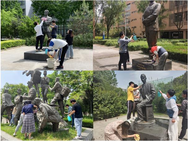 师生对雕塑进行一一擦拭和清洁,不放过任何一个小缝隙。经历了风吹日晒,雕塑上堆积了些许灰尘和杂土,有的地方甚至布满蜘蛛网。大家齐心协力,女生拿着毛巾对较低的人物雕塑进行擦拭,男生拿着喷壶,长柄刷对较高的雕塑进行冲刷,为先辈们擦去周身灰尘,让雕塑重现雄姿。捡拾了雕塑周边的垃圾和枯枝,对周围环境进行了清洁。