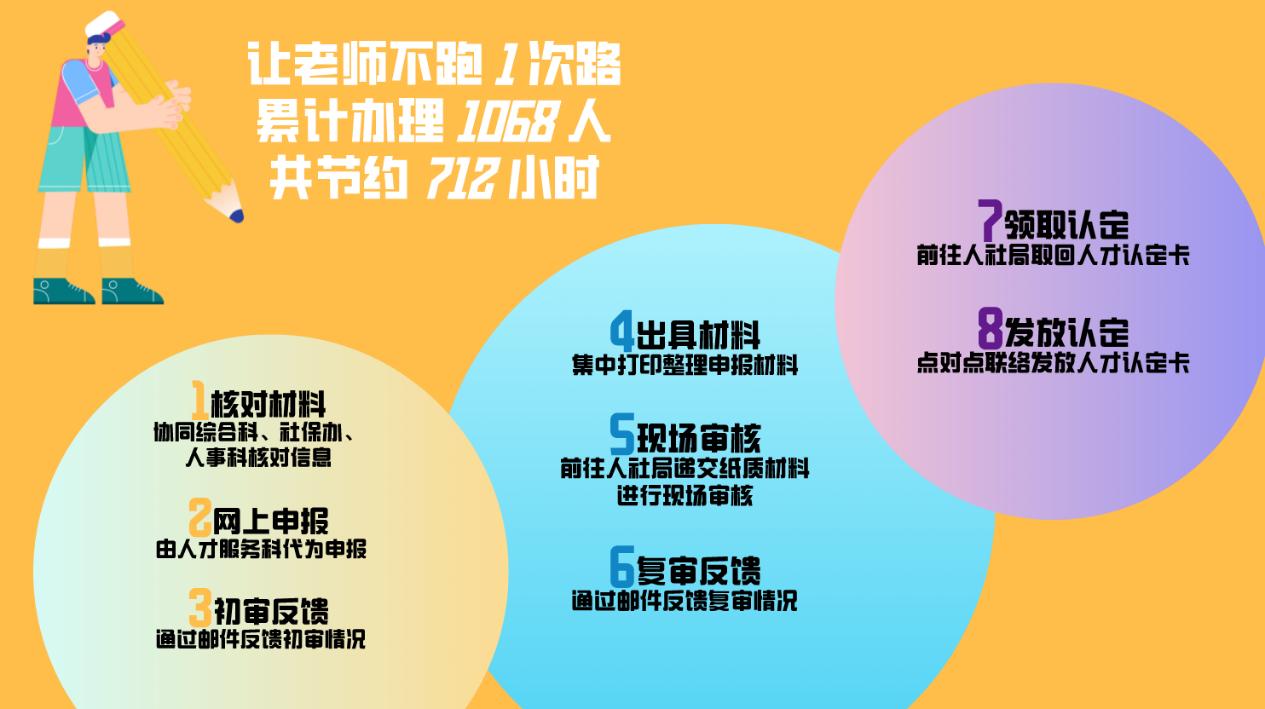 一是优化内部协同机制,构建 “量化服务矩阵”。织密部内小网,织广校内大网,以“让教师不跑一次路”为目标,优化西安市人才认定工作程序,累计节省教师时间约712小时。同时,会同国资处前往雁塔区住建局申领DE类人才住房补贴,打通人才认定服务保障“最后一公里”,为省内第一所申领补贴的部属高校;会同财务处及时认领上级拨付经费并做到3个工作日发放到位;会同信息网络技术中心等部门优化入职流程并做到当日完成所有手续;会同各职能部门及时上门解决相关个性问题。