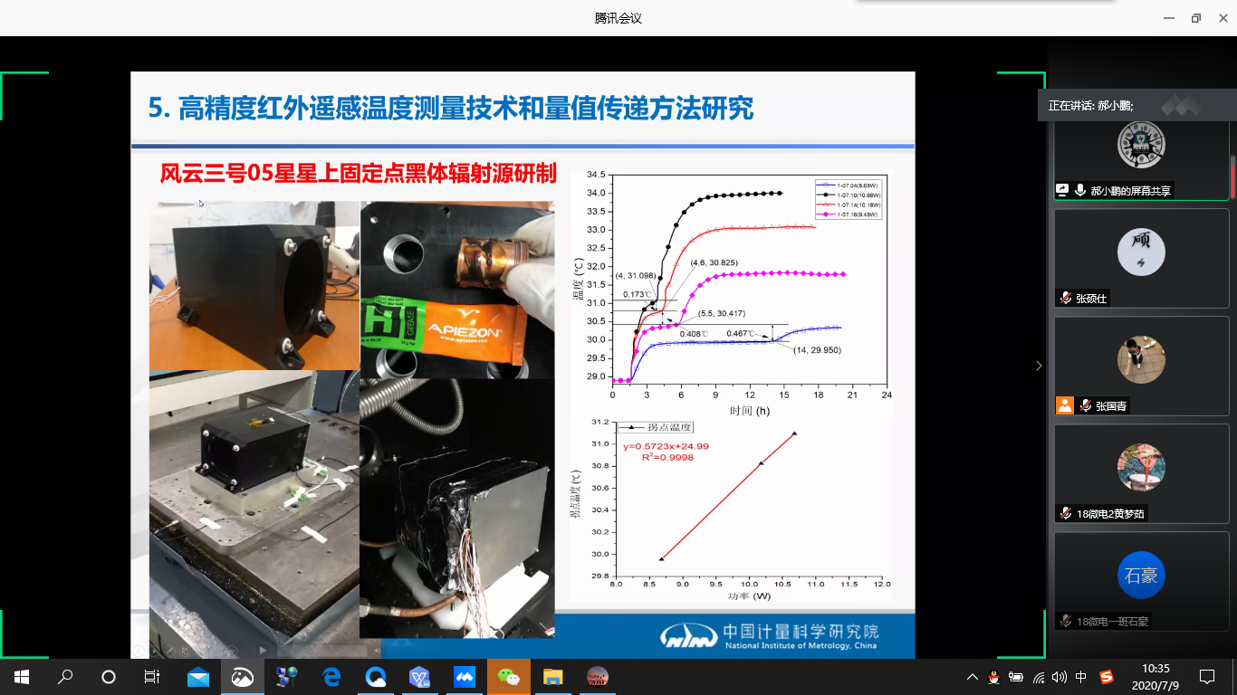 学院党委十分重视学术交流和人才培养。2020年7月9日上午,学院邀请中国计量科学研究院两位专家为学院师生开展了线上学术讲座。郝小鹏研究员和孙建平副研究员分别做了题为“航天红外遥感高光谱亮温定标与计量技术研究进展”和“温度计量进展及在海洋温度测量的应用研究”的学术报告。140余名师生参加了此次线上学术报告会。内容涉及真空低背景红外遥感高光谱亮度温度计量标准,红外标准传递辐射温度计,空间高精度红外辐射基准源研制,星载微型固定点温度标准器研发等方面的最新研究进展。报告就具体学术问题以及学院与中国计量科学研究院的学术交流合作和人才培养合作开展了深入的讨论,气氛热烈。此次学术讲座开阔了理学院师生在计量科学领域的视野,了解了该领域的前沿,理学院师生表示收获良多。