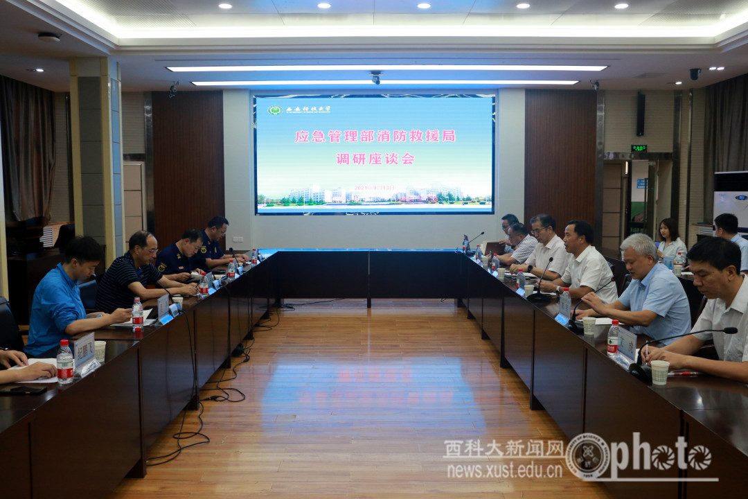 9月13日下午,应急管理部消防救援局党委委员、总工程师周天、防火监督处一级指挥长吴丹、消防救援局新闻宣传处二级督导员纪鹏飞、陕西省消防救援总队政治委员李瑞丰、总工程师吴钢一行来我校调研交流。调研座谈会在雁塔校区第一会议室召开,我校党委副书记陈春林、副校长邓军,原副校长李树刚、科技处、学科办、安全学院负责人及安全学院相关教师参加了会议。会议由邓军主持。