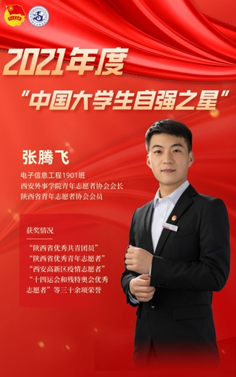 张腾飞,工学院电子信息工程1901班,西安外事学院青年志愿者协会会长。2020年获大学生数学建模省级二等奖,2020年高新区大学生志愿者,2020年大学生创新创业项目“纳米雲”智能空气净化纱网获项目获省级立项,2021年获中华人民共和国第十四届运动会全国第十一届残运会暨第八届特奥会优秀志愿者,2021年获中华人民共和国第十四届运动会全国第十一届残运会暨第八届特奥会西安赛区优秀志愿者,2022年获陕西省优秀共青团员,2022年初疫情期间,“腾飞式服务”温暖外事校园,个人事迹先后被人民日报、陕西民办教育协会、西安高新、全国思想政治工作网、学习强国、教育部新闻办等宣传平台所报道。曾获西安外事学院三好学生、先进青年志愿者、“学雷锋”志愿服务月先进个人,挑战杯等多项荣誉。