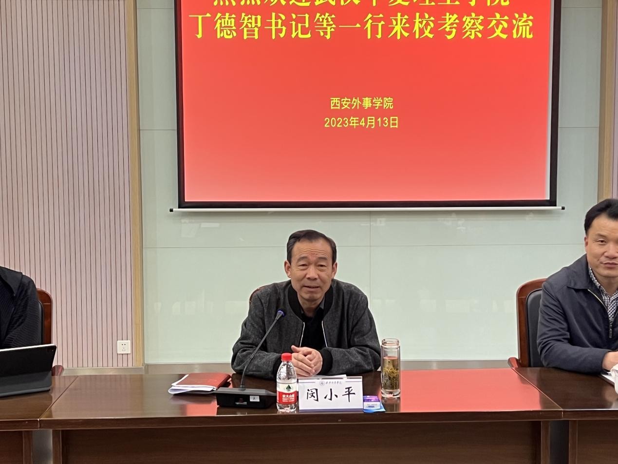 4月13日上午,武汉华夏理工学院党委书记丁德智一行八人到访西安外事学院,就高校党建、思政课改革等事宜进行深入考察与交流。西安外事学院党委书记闵小平,学工部部长赵联章等相关工作负责人参加座谈会。