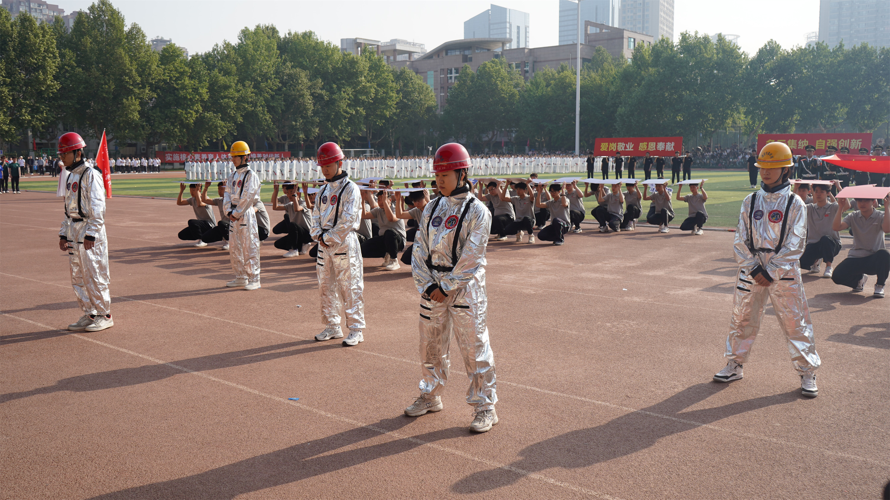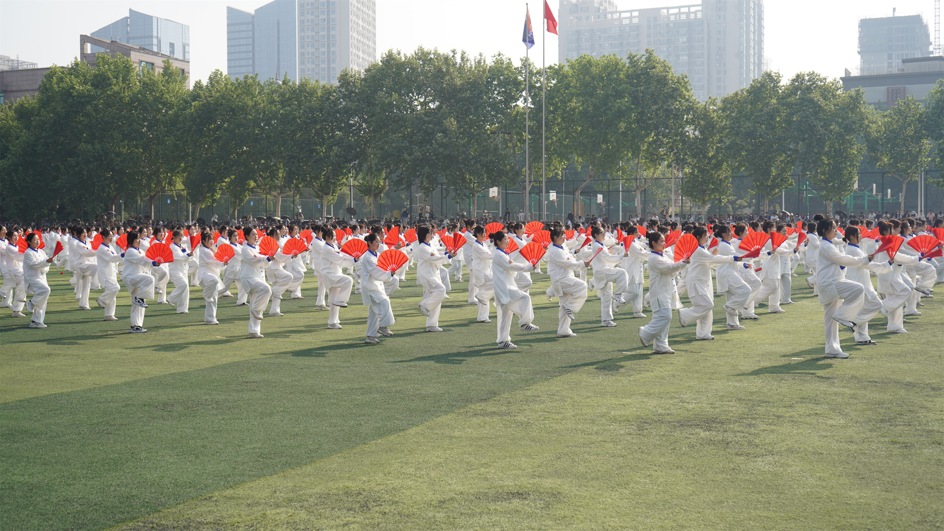 团体操千人太极扇表演《健康校园 和美外事》震撼上演。同学们扇展如虹,壮势如潮,尽显中华传统武术魅力。排演的XAIU、五角星、一帆风顺造型表达了对伟大祖国、对和美校园的真挚祝福。