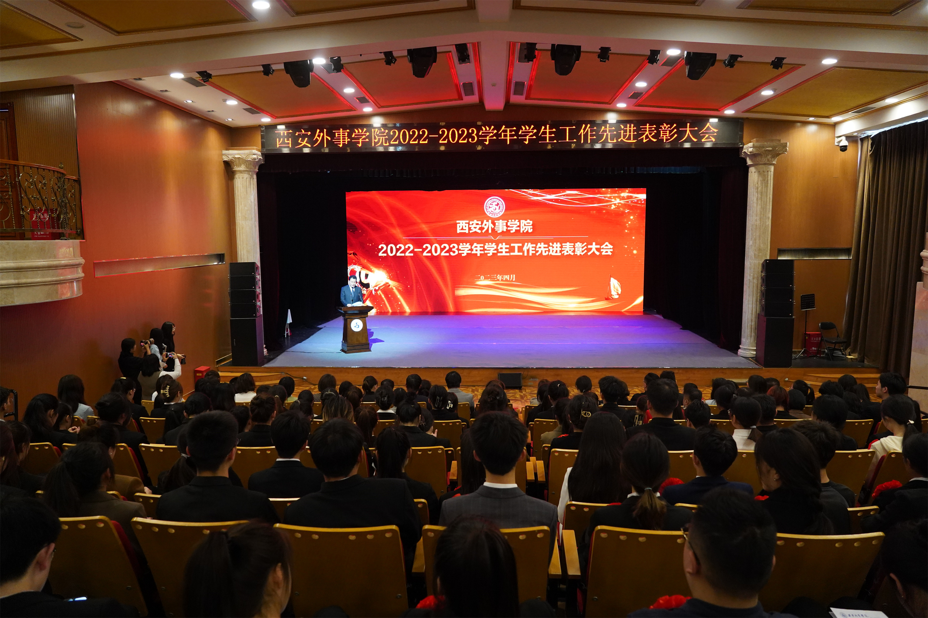 刘亚杰宣布了关于表彰2021-2022学年国家奖学金、国家励志奖学金获得者,2021-2022学年宝军奖学金获得者,陕西省高校征兵工作先进单位,陕西省学生资助工作先进单位,陕西省优秀辅导员的文件。