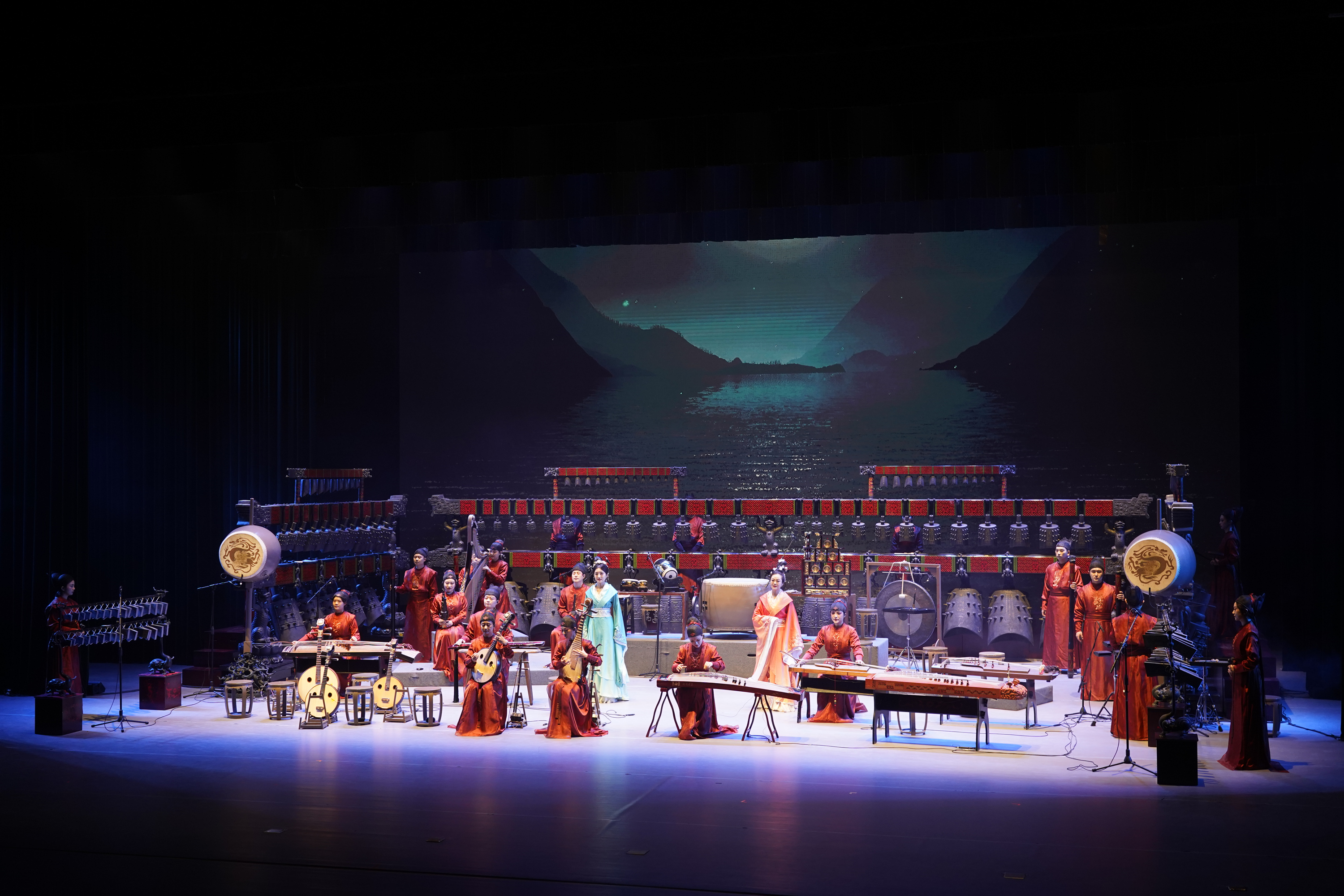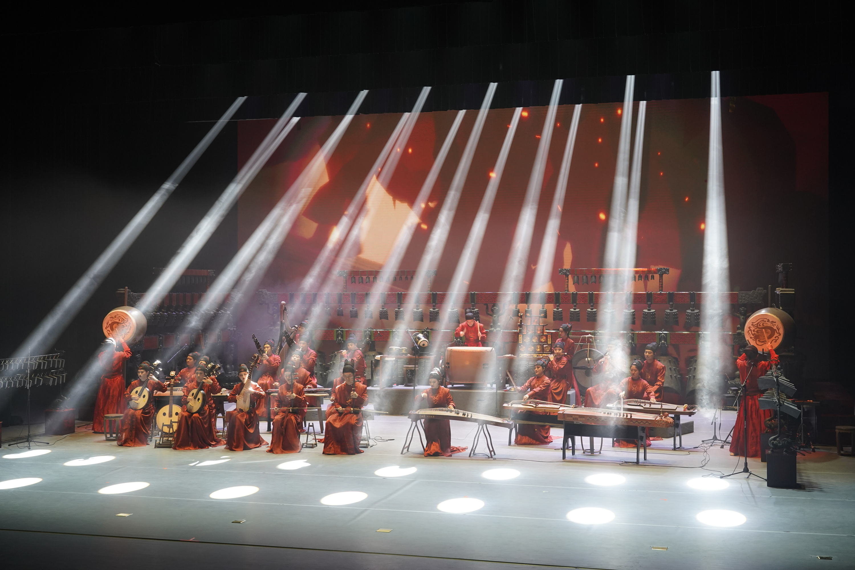 庄重的编钟曲《朝乐》拉开了音乐会的序幕,西安外事鼓乐团乐师们将“天子长安”编钟与其他中国传统乐器和谐演绎。这场《大唐雅韵·钟鸣鼓乐》音乐会是乐团对传统音乐文化守正创新的代表作品,既体现出大唐雅乐盛世风貌,又释放出当代音乐表演艺术的非凡魅力。《朝乐》让“体道前贤,礼乐为先”身临其境;西安鼓乐《靛花开》传递俗派鼓乐社的音韵;编钟曲《春江花月夜》展示“孤篇盖全唐”的气势;器乐合唱曲《万世太平》是黄藤作词作曲,创作于北宋思想大家张载先生诞辰千年之际的传统古风音乐作品,礼赞华夏儿女传承文脉、仁心天下的气度与精神。